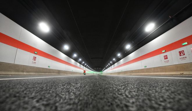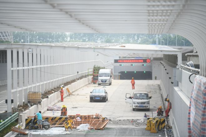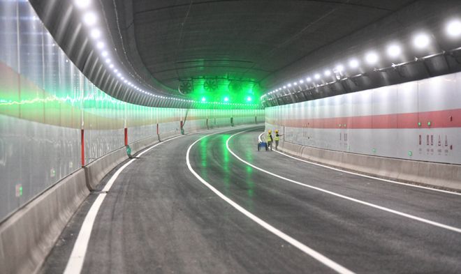 黑色顶部、红白相间的装饰板,显得大气又不失一抹亮色。部分标线也已划好,三车道清晰可见,基本和通车时的轮廓无异。左线隧道内,沥青摊铺已完成50%以上,工人们正在安装最后几块装饰板,